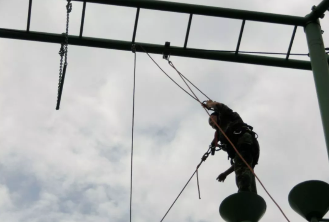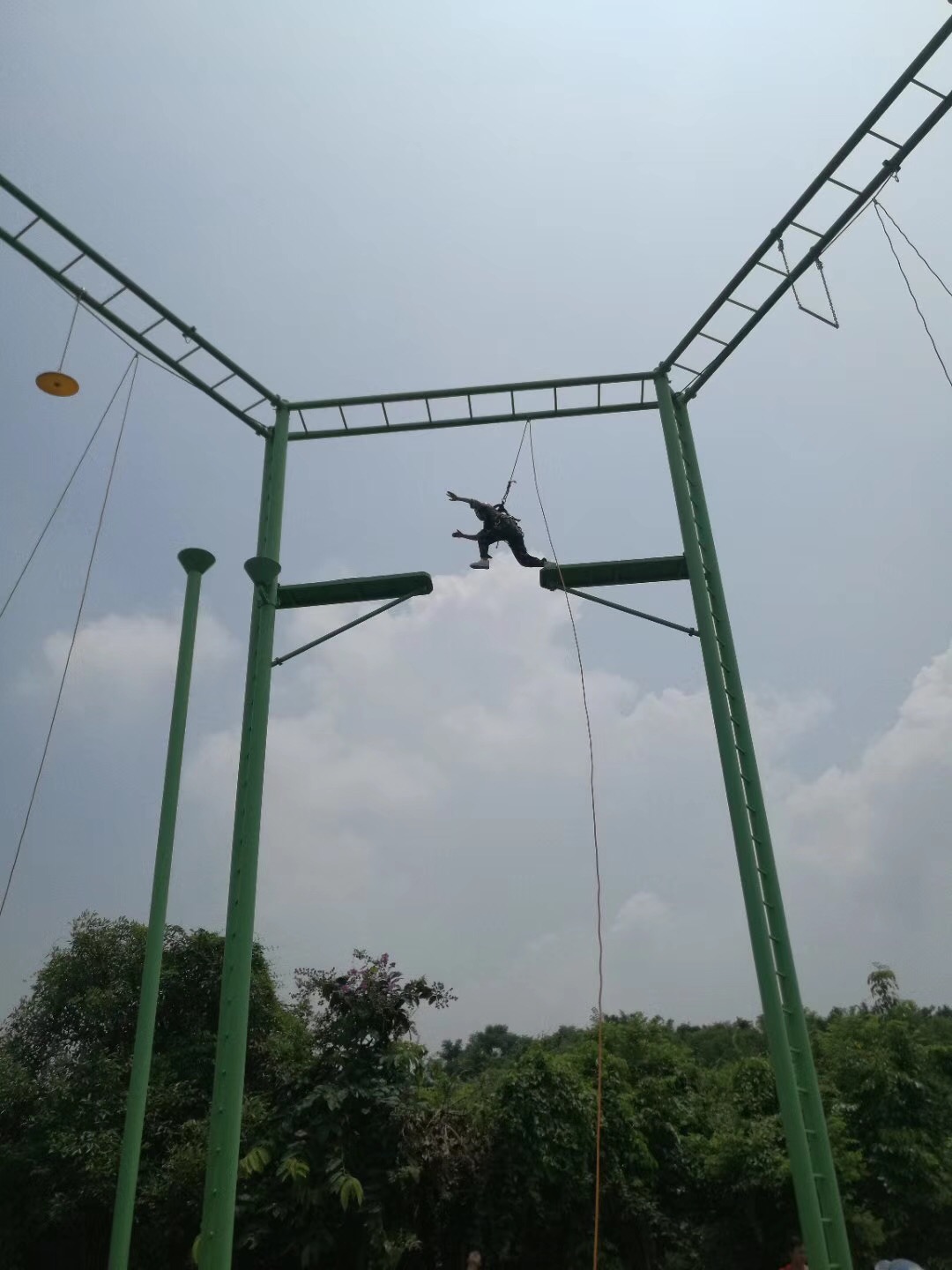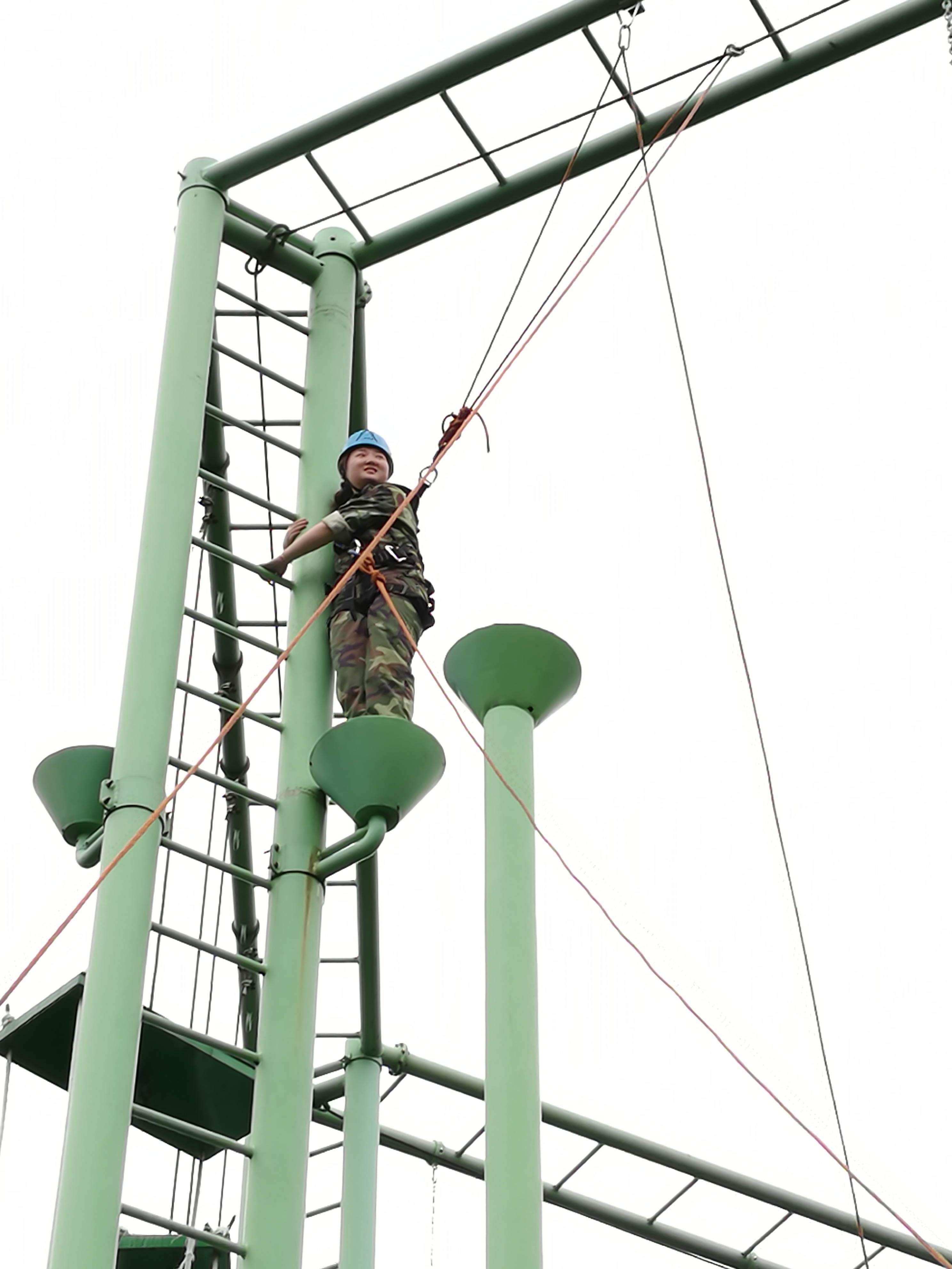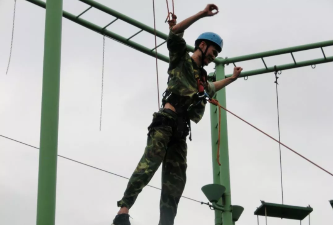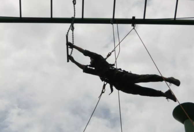 空中單杠是一項自我挑戰的高空高難度項目,隊員需要在9米高台,直徑25公分的圓台上站立,奮力跳躍抓住空中的單杠。挑戰自我,客服心理障礙,培養自信心。麵對機遇,能果斷把握,增強自我決斷的能力,以積極冷靜的心態去爭取。樹立對困難、對問題不懼不卻以及挑戰的魄力。